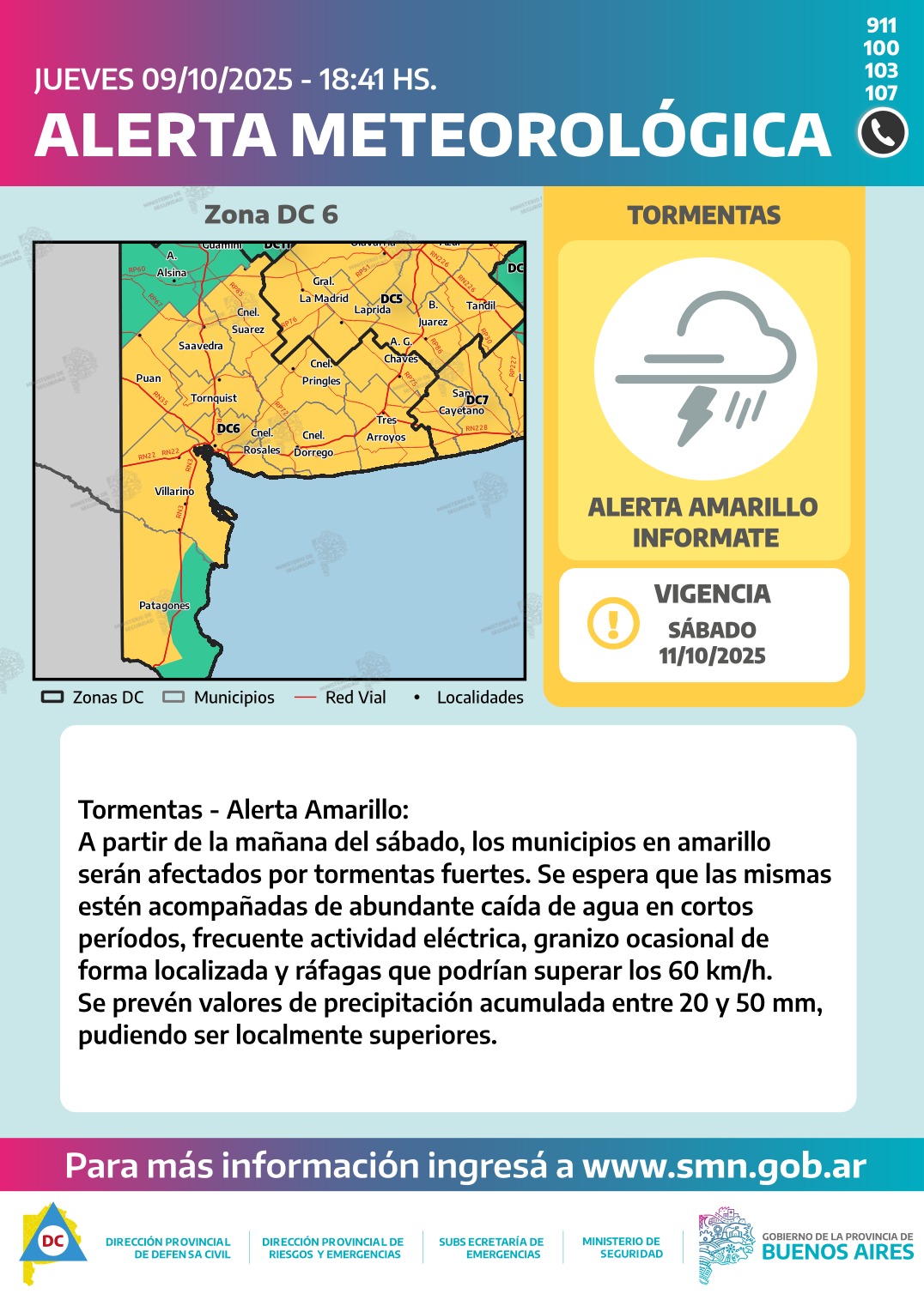El fenómeno afectará a los distritos de Villarino, Puan, Saavedra, Coronel Suárez, Tornquist, Bahía Blanca, Coronel Rosales, Monte Hermoso Coronel Dorrego, Coronel Pringles y el oeste de Patagones. La advertencia también comprende a toda la provincia de La Pampa.
