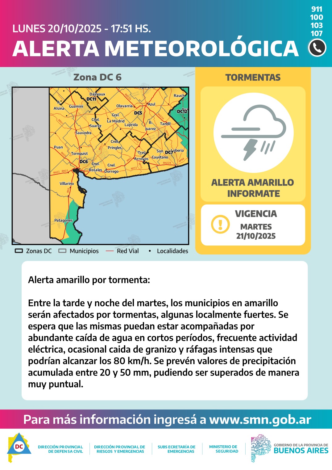 Continuará el tiempo inestable con probabilidad de tormentas aisladas durante la mañana. A partir de las 13 hs y hasta las 21hs, se prevén lluvias y tormentas más generalizadas. Algunas de estas tormentas pueden ser localmente fuertes y estar acompañadas principalmente por ráfagas que pueden alcanzar los 70 km/h y ocasional caída de granizo. Se estiman acumulados de entre 10 y 20 mm, pudiendo ser mayores de formal local.
