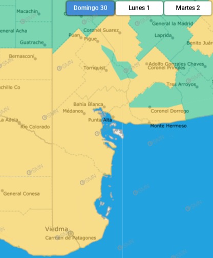 La advertencia abarca, además de nuestra ciudad, los distritos de Patagones, Villarino, Puan, Saavedra, Coronel Suárez, Coronel Rosales, Monte Hermoso, Tornquist y el sur de Coronel Dorrego. También incluye el sur de La Pampa y el norte de Río Negro.