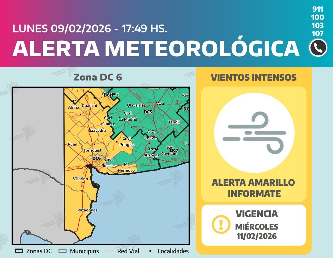 El aviso contempla los distritos de Patagones, Villarino, Puan, Bahía Blanca, sur de Coronel Dorrego, Monte Hermoso, Saavedra, Coronel Rosales, Tornquist y Coronel Suárez, además de la provincia de La Pampa y gran parte de Río Negro.