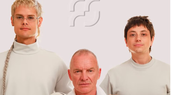 La imagen, de fuerte impronta minimalista y simbólica, muestra a Sting en el centro de la escena, sentado, con una expresión serena y casi meditativa, mientras CA7RIEL y Paco Amoroso aparecen de pie a ambos lados, apoyando sus manos sobre los hombros del músico británico. Los tres visten prendas claras, en una paleta monocromática que remite al blanco, beige y crema, reforzando una estética pulcra, contenida y alejada del exceso visual que históricamente caracterizó al dúo.