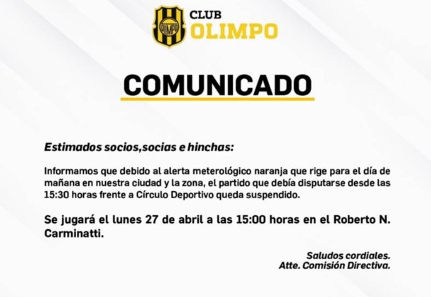 Fue reprogramado el partido que debía disputar este domingo Olimpo, ante Círculo Deportivo, por el Federal A, por el alerta naranja pronosticado para nuestra ciudad y parte de la Provincia.